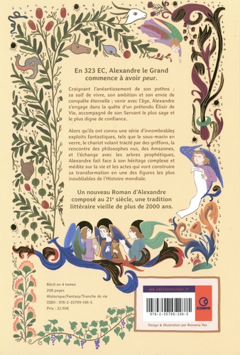 En 323 EC, Alexandre le Grand commence à avoir peur... Craignant l'anéantissement de son pothos ; sa soif de vivre, son ambition et son envie de conquête éternelle ; venir avec l'âge, Alexandre s'engage dans la quête d'un prétendu Elixir de Vie, accompagné de son Servant le plus sage et le plus digne de confiance. Alors qu'ils ont connu une série d'innombrables exploits fantastiques, tels que le sous-marin en verre, le chariot volant tracté par des griffons, la rencontre des philosophes nus, des Amazones, et l'échange avec les arbres prophétiques, Alexandre fait face à son héritage complexe et médite sur la vie et les actes qui vont construire sa transformation en une des figures les plus inoubliables de l'Histoire mondiale. Une réécriture du 21ème siècle par Reimena Yee, autrice de Séance Tea Party et de la série Le Marchand de Tapis de Constantinople, du Roman d'Alexandre, une tradition littéraire vieille de plus de 2000 ans.