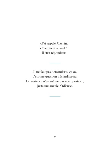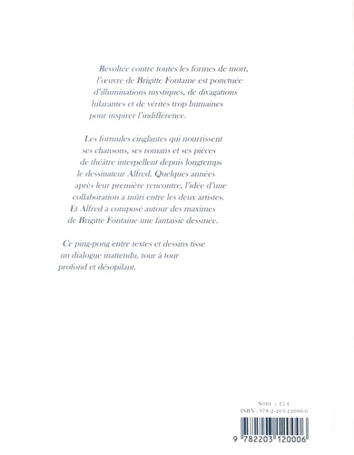 Révoltée contre toutes les formes de mort, l'oeuvre de Brigitte Fontaine est ponctuée d'illuminations mystiques, de divagations hilarantes et de vérités trop humaines pour inspirer l'indifférence. Les formules cinglantes qui nourrissent ses chansons, ses romans et ses pièces de théâtre interpellent depuis longtemps le dessinateur Alfred. Quelques années après leur première rencontre, l'idée d'une collaboration a mûri entre les deux artistes. Et Alfred a composé autour des maximes de Brigitte Fontaine une fantaisie dessinée. Ce ping-pong entre textes et dessins tisse un dialogue inattendu, tour à tour profond et désopilant.