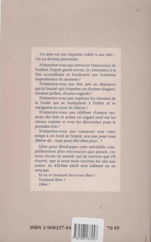 Un isme est une étiquette collée à une idée... On en devient prisonnier. N'aimeriez-vous pas retrouver l'innocence de l'enfant, l'esprit grand ouvert, la conscience à la fois accueillante et foudroyée par l'extrême impertinence du moment ? N'aimeriez-vous pas être pris au dépourvu par la beauté qui s'exprime en d'autres langues, d'autres jardins, d'autres regards ? N'aimeriez-vous pas explorer les chemins de la bonté qui se multiplient à l'infini et se rejoignent au coeur de chacun ? N'aimeriez-vous pas célébrer d'autres versions des faits et porter un regard neuf sur les choses comme si vous les découvriez pour la première fois ? N'aimeriez-vous pas consacrer tout votre temps à cet éveil de l'esprit, non pas pour vous libérer de... mais pour être libre pour... ? Libre pour développer cette inévitable compréhension plus nécessaire que jamais, car nous vivons un monde qui ne survivra que s'il s'ouvre, que si nous nous ouvrons les uns aux autres. Le XXIème siècle sera tolérant ou ne sera pas. Et en ce moment êtes-vous libre ? Vraiment libre ? Libre !