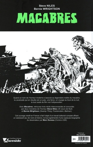 Quand un nom de l'horreur moderne s'associe au légendaire maitre du macabre, la cavalcade qui en résulte est un pulp, une farce, un voyage au bout de la nuit, le tout zeste de film noir hollywoodien. Avec Macabres, retrouvez trois récits interconnectés et concoctes par deux monstres de l'horreur Steve Niles (30 Jours de Nuit) et Bernie Wrightson (Swamp Thing, Frankenstein, Batman). Cet ouvrage inédit en France a fait l'objet d'un travail éditorial complet offrant un saisissant jeu de noirs et blancs, le tout agrémenté d'une copieuse biographie du dessinateur par Mare Duveau (Comics USA).