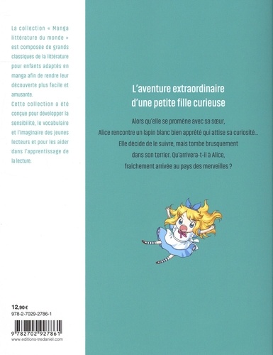 Découvrez le grand classique de Lewis Carroll en manga ! Alors qu'elle se promène avec sa soeur, Alice rencontre un Lapin Blanc qui attise sa curiosité... Elle décide de le suivre, mais tombe brusquement dans son terrier. Qu'arrivera-t-il à Alice, fraîchement arrivée au pays des merveilles ? La collection " Manga littérature du monde " est composée de grands classiques de la littérature pour enfants adaptés en manga afin de rendre leur lecture plus facile et amusante. Cette collection a été conçue pour développer la sensibilité, le vocabulaire et l'imaginaire des jeunes lecteurs et pour les aider à l'apprentissage de la lecture.