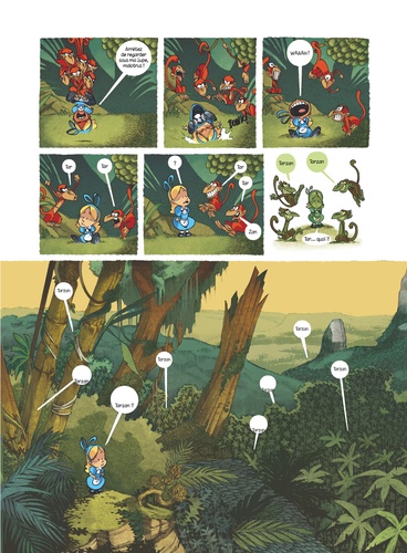 L'accident bête : en courant après le Lapin Blanc, Alice a pris une noix de coco sur la tête. Sonnée par le choc, elle tombe dans un trou, et émerge en plein milieu de la Jungle ! La pauvre est complètement paumée, et ses ennuis ne sont pas finis : tous les singes qu'elle croise la prennent pour Tarzan... Heureusement, Eddy le mandrill finit par la croire, et la prévient : il faut qu'elle déguerpisse fissa, pour éviter les dents du tigre ! Ce dernier est en effet devenu Seigneur officiel de la Jungle depuis le départ de l'Homme-Singe. Mais retourner d'où elle vient ne va pas être de la tarte, puisque l'arbre dont elle a émergé a déjà pris la poudre d'escampette...