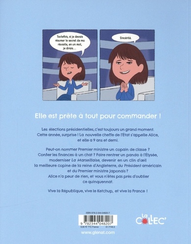 Les élections présidentielles, c'est toujours un grand moment. Cette année, surprise ! La nouvelle cheffe de l'Etat s'appelle Alice, et elle a 9 ans et demi. Peut-on nommer Premier ministre un copain de classe ? Confier les finances à un chat ? Faire rentrer un panda à l'Elysée, moderniser La Marseillaise, devenir en un clin d'oeil la meilleure copine de la reine d'Angleterre, du Président américain et du Premier ministre japonais ? Alice n'a peur de rien, et vous n'êtes pas près d'oublier ce quinquennat. Vive la République, vive le Ketchup, et vive la France !