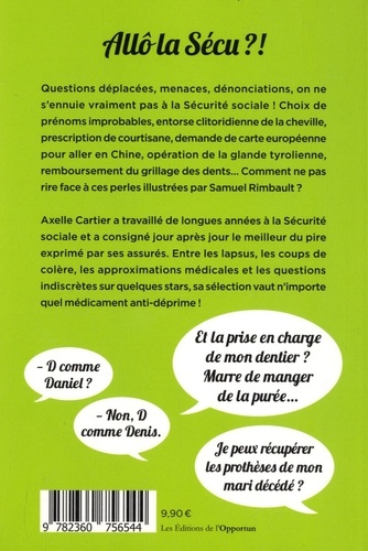 Questions déplacées, menaces, dénonciations, on ne s'ennuie vraiment pas à la Sécurité sociale ! Choix de prénoms improbables, entorse clitoridienne de la cheville, prescription de courtisane, demande de carte européenne pour aller en Chine, opération de la glande tyrolienne, remboursement du grillage des dents... Comment ne pas rire face à ces perles illustrées par Samuel Rimbault ? Axelle Cartier a travaillé de longues années à la Sécurité sociale et a consigné jour après jour le meilleur du pire exprimé par ses assurés. Entre les lapsus, les coups de colère, les approximations médicales et les questions indiscrètes sur quelques stars, sa sélection vaut n'importe quel médicament anti-déprime !