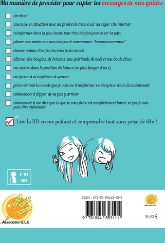 Ma manière de procéder pour capter les messages de mes guides : un rituel ; une mise en situation avec un protocole trouvé sur un super site internet ; m'enfermer dans la plus haute tour d'un donjon pour avoir la paix ; placer mes mains sur mes tempes et marmonner "hummmmmmmm" ; danser autour d'un feu les bras levés au ciel ; allumer des bougies, de l'encens, une guirlande de noël et une boule disco ; me mettre dans la position du lotus et ne plus bouger d'un Q ; me forcer à m'empêcher de penser ; prévenir tout le monde que je vais me transformer en récepteur divin là maintenant ; commencer à flipper de ne pas y arriver ; commencer à me dire que ce que je veux faire est complètement barré, et que je suis peut-être siphonnée ; Lire la BD en me poilant et comprendre tout sans prise de tête !