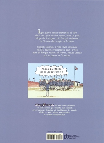 Allons Z'enfants, est une nouvelle série jeunesse en trois tomes, qui raconte avec humour aux enfants le monde d'hier pour comprendre le monde d'aujourd'hui par... "le petit bout de la lorgnette". L'album se divise en deux parties : une première grande partie sous la forme d'un récit et une deuxième partie, plus courte, sous la forme documentaire, vient préciser certains points historiques du récit. Tome 1 (sur 3) : François & Josette (de 1870 à 1918) : 1891. Depuis toujours, les Quélennec cultivent fièrement la terre et vivent aux rythmes des saisons dans leur cher Finistère. Joseph et Jeanne-Louise ne peuvent donc qu'espérer que leurs garçons, François et Yves, reprennent l'affaire familiale. Mais François, lui, ne rêve que d'une chose : parcourir le monde et ses trésors infinis qui s'ouvrent à lui à l'aube du XXe siècle. Alors, sans trop savoir dans quoi il s'embarque, il prend une décision qui va bouleverser son destin : s'engager dans la Coloniale. Dans son régiment, il découvrira Paris, l'Afrique de l'Ouest, les horreurs de la colonisation, les discours haineux et l'antisémitisme... mais aussi l'amour pour Josette et une vocation pour la photographie. Si l'histoire de François se termine sur les champs de bataille de la Grande Guerre, les aventures de Jean, son jeune fils, ne font que commencer...