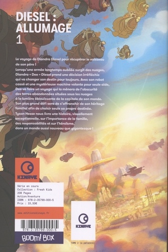 Le voyage de Diandra Diesel pour récupérer le vaisseau de son père ! Lorsqu'une armée longtemps oubliée surgit des nuages, Diandra "Dee" Diesel prend une décision irréfléchie qui va changer son destin pour toujours. Avec son robot cassé et une mystérieuse machine volante pour seule aide, Dee va faire un voyage qui la mènera de l'obscurité des terres abandonnées situées sous les nuages à la lumière éblouissante de la capitale de son monde. Son plus grand défi sera de s'affranchir de son héritage familial afin de choisir seule sa propre destinée. Tyson Hesse nous livre une histoire, visuellement exceptionnelle, sur l'importance de la famille, des responsabilités et sur l'héroïsme, dans un monde aussi nouveau que gigantesque !