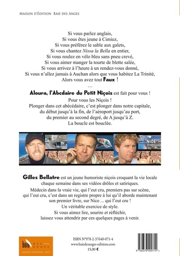 Si vous parlez anglais, si vous êtes jeune à Cimiez, si vous préférez le sable aux galets, si vous chantez Nissa la Bella en entier, si vous roulez en vélo bleu sans pneu crevé, si vous aimer manger la tourte de blette salée, si vous arrivez à l'heure à un rendez-vous donné, si vous n'allez jamais à Auchan alors que vous habitez La Trinité, alors vous avez tout Faux ! Aloura, l'Abcdaire du Petit Niçois est fait pour vous ! Pour vous les Niçois ! Plonger dans cet abécédaire, c'est plonger dans notre capitale, du début jusqu'à la fin, de l'aéroport jusqu'au port, du premier au second degré, de A jusqu'à Z. La boucle est bouclée.