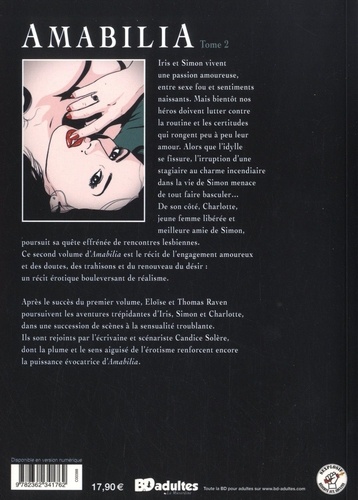 L'érotisme chic en BD a trouvé ses maîtres ! Iris et Simon vivent une passion amoureuse, entre sexe fou et sentiments naissants. Mais bientôt nos héros doivent lutter contre la routine et les certitudes qui rongent peu à peu leur amour. Alors que l'idylle se fissure, l'irruption d'une stagiaire au charme incendiaire dans la vie de Simon menace de tout faire basculer... De son côté, Charlotte, jeune femme libérée et meilleure amie de Simon, poursuit sa quête effrénée de rencontres lesbiennes. Ce second volume d'Amabilia est le récit de l'engagement amoureux et des doutes, des trahisons et du renouveau du désir : un récit érotique bouleversant de réalisme.