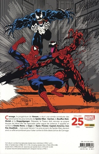 Carnage a composé une armée avec les plus sanguinaires adversaires de Spider-Man afin d'inonder de sang les rues de New York. Dépassé par le nombre de ses adversaires, Spidey n'a d'autre choix que de rassembler sa propre équipe : la Chatte Noire, Firestar, Captain America, la Cape et l'Epée, Iron Fist, Deathlok. Osera-t-il faire appel à Venom ? L'une des sagas les plus fracassantes de l'histoire de Spider-Man est recueillie dans ce nouvel album de la collection EPIC, qui vous propose de grands moments de l'épopée Marvel. Broché ou cartonné, à vous de choisir, nous vous garantissons dans tous les cas que le plaisir sera total !