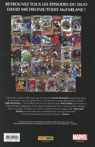 Peter Parker a tout pour être heureux, il est l'héroïque Spider-Man et il a pour compagne la merveilleuse Mary Jane Watson, à qui il vient de demander la main. Mais les menaces sont nombreuses, en particulier celle du symbiote qui a servi de costume à Spider-Man, et qui va devenir Venom ! Mais le Caméléon, le Scorpion ou encore le Bouffon Vert sont aussi de la partie ! A la fin des années 80, alors que David Michelinie reprend les scénarios du titre Amazing Spider-Man, il est associé au jeune dessinateur canadien Todd McFarlane, qui deviendra le créateur de Spawn et l'un des fondateurs d'Image. C'est surtout un âge d'or artistique pour le Tisseur, avec en particulier l'apparition du célèbre Venom.