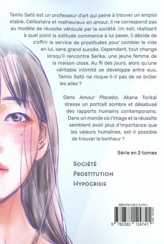 Dans Amour Placebo, Akane Torikai dresse un portrait sombre et désabusé des rapports humains contemporains. Dans un monde où l'image et la réussite semblent avoir plus d'importance que les valeurs humaines, est-il possible de trouver le bonheur ? Tamio Satô est un professeur d'art qui peine à trouver un emploi stable. Célibataire et malheureux en amour, il ne correspond pas au modèle de réussite véhiculé par la société. Un soir, réalisant à quel point la solitude commence à lui peser, il décide de s'offrir le service de prostituées pour combler le vide en lui, sans grand succès. Cependant, tout change lorsqu'il rencontre Serika, une jeune femme de la maison close. Au fil des jours, alors qu'une véritable intimité se développe entre eux, Tamio Satô ne risque-t-il pas de se brûler les ailes ?
