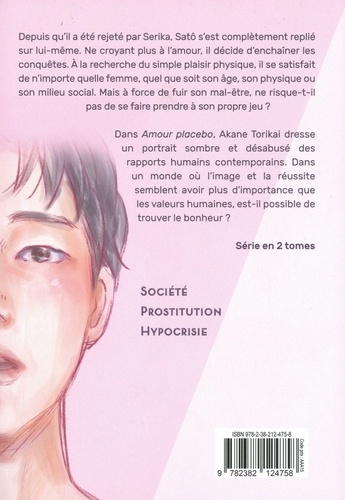 Dans Amour placebo, Akane Torikai dresse un portrait sombre et désabusé des rapports humains contemporains. Dans un monde où l'image et la réussite semblent avoir plus d'importance que les valeurs humaines, est-il possible de trouver le bonheur ? Depuis qu'il a été rejeté par Serika, Satô s'est complètement replié sur lui-même. Ne croyant plus à l'amour, il décide d'enchaîner les conquêtes. A la recherche du simple plaisir physique, il se satisfait de n'importe quelle femme, quel que soit son âge, son physique ou son milieu social. Mais à force de fuir son mal-être, ne risque-t-il pas de se faire prendre à son propre jeu ?