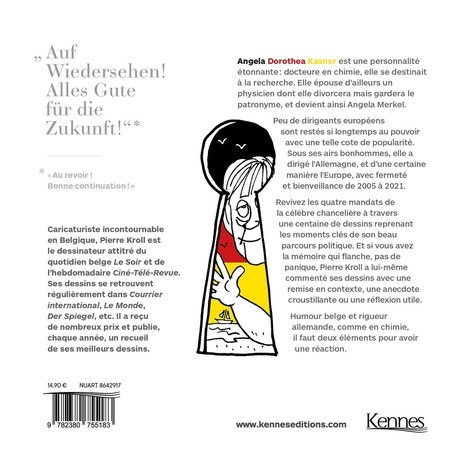 Angela Dorothea Kasner est une personnalité étonnante : docteure en chimie, elle se destinait à la recherche. Elle épouse d'ailleurs un physicien dont elle divorcera mais gardera le patronyme, et devient ainsi Angela Merkel. Peu de dirigeants européens sont restés si longtemps au pouvoir avec une telle cote de popularité. Sous ses airs bonhommes, elle a dirigé l'Allemagne, et d'une certaine manière l'Europe, avec fermeté et bienveillance de 2005 à 2021. Revivez les quatre mandats de la célèbre chancelière à travers une centaine de dessins reprenant les moments clés de son beau parcours politique. Et si vous avez la mémoire qui flanche, pas de panique, Pierre Kroll a lui-même commenté ses dessins avec une remise en contexte, une anecdote croustillante ou une réflexion utile. Humour belge et rigueur allemande, comme en chimie, il faut deux éléments pour avoir une réaction.