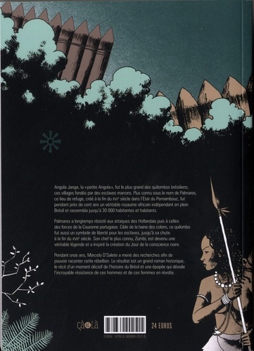 Angola Janga, la "petite Angola", fut le plus grand des quilombos brésiliens, ces villages fondés par des esclaves marrons. Plus connu sous le nom de Palmares, ce lieu de refuge, créé à la fin du XVIe siècle dans l'Etat du Pernambouc, fut pendant près de cent ans un véritable royaume africain indépendant en plein Brésil et rassembla jusqu'à 30 000 habitantes et habitants. Palmares a longtemps résisté aux attaques des Hollandais puis à celles des forces de la Couronne portugaise. Cible de la haine des colons, ce quilombo fut aussi un symbole de liberté pour les esclaves, jusqu'à sa chute à la fin du xvue siècle. Son chef le plus connu, Zumbi, est devenu une véritable légende et a inspiré la création du Jour de la conscience noire. Pendant onze ans, Marcelo D'Salete a mené des recherches afin de pouvoir raconter cette rébellion. Le résultat est un grand roman historique, le récit d'un moment décisif de l'histoire du Brésil et une épopée qui dévoile l'incroyable résistance de ces hommes et de ces femmes en révolte.