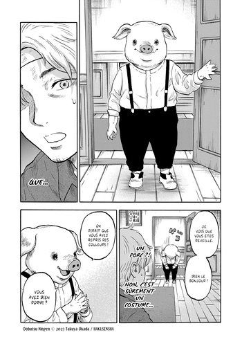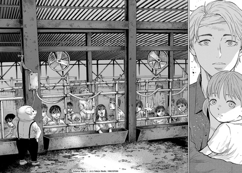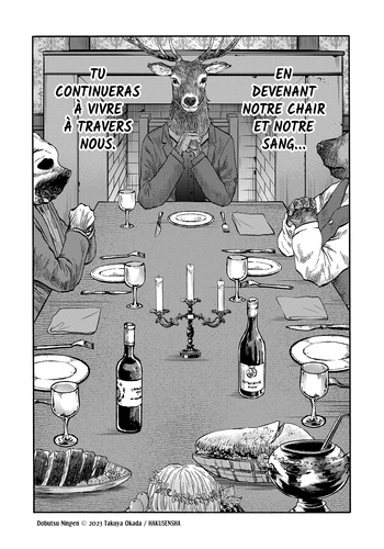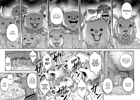 Et vous, pour quelle raison mangez-vous des êtres vivants ? A la suite d'un accident de voiture, un père et sa fille se retrouvent conviés au banquet d'un étrange groupe d'animaux anthropomorphes. Mais ce qui ressemble d'abord à un accueil chaleureux vire très vite au cauchemar : en visitant leur ferme, ils découvrent avec horreur que pour ces créatures, les humains ne sont que du bétail... qu'ils consomment au quotidien ! Plus que des animaux à l'allure humaine, ceux qui travaillent dans cet "élevage d'humains" se révèlent être de véritables monstres à l'allure animale. Le jeune homme et sa fille parviendront-ils à s'échapper de cette sinistre demeure ? Avec sa première oeuvre, Takuya Odaka signe avec Animal Human un thriller déroutant, où l'interdit et le cauchemar s'inversent ! Une fable inversée saisissante qui s'attaque à l'éthique de notre société moderne, souvent trop passive. "Cette Ferme des animaux cauchemardesque est un titre à lire pour tous les amateurs d'horreurs". Sanctuary. fr " Entre bodyhorror et questionnement éthique, ce seinen en trois tomes retourne l'estomac autant que les certitudes". Japan Max " Un thriller déroutant" France Info