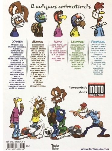 Les Animotards sont une bande de copains motards dont les deux protagonistes principaux sont Xavier le lièvre et Martin la tortue. Ils possèdent une concession commerciale de motos où défile toute une galerie de personnages hauts en couleur qui viennent acheter, louer, vendre, échanger toute une panoplie de motos, d'objets divers et variés relatifs à la moto, des brèves de comptoirs, des sentiments, de la philosophie et des bêtises abyssales. Une pétarade de gags mesurés et scellés à la clé à molette par la rigolométrie imparable de Vincent Haudiquet et le dessin très cartoon et super vivant, ajusté très précisément à la clé de douze, par Nathalie Jean-Bart.