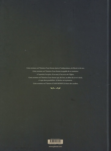 " Tu as la fièvre du pirate ma fille " En 1718 Ann Cormack débarque à Nassau sur l'île de New Providence aux Bahamas Arrivée de Caroline du Sud cette jeune irlandaise qui fut élevée comme un garçon par un père procureur rêve d'une autre vie que celle que sa condition de femme lui impose Pour échapper à son destin elle épouse un pirate de petite envergure James Bonny à condition de devenir son quartier-maître Grâce à cet accord Ann Bonny prend la mer Travestie en homme elle est prête à écumer les océans Mais aux yeux de ce mari uniquement intéressé par l'héritage qu'il pourrait toucher Ann reste une simple femme dans un monde d'hommes Bientôt elle s'aperçoit que son mari James oeuvre en sous-main à la création d'une milice destinée à faire la chasse aux pirates aidé d'Ornigold Elle décide de le quitter mais James ne l'entend pas ainsi et cherche à la retenir pour la vendre comme prostituée à Cuba Elle lui échappe et dès lors trahie abandonnée à son sort elle va laisser libre cours à sa soif de liberté et de piraterie Elle commence à voler des navires avec un autre corsaire Pierre Bousquet avant de recruter son propre équipage et de faire la connaissance d'un des pirates les plus redoutés le capitaine Jack Rackham alias Calico Jack A ses côtés Ann Bonny va forger sa propre légende celle d'une femme indépendante et sulfureuse qui se lancera à l'abordage avec audace et deviendra le fléau du gouvernement britannique... Habitué aux fresques maritimes Franck Bonnet nous entraîne dans une nouvelle aventure épique en retraçant à travers ce diptyque l'histoire vraie de la plus grande femme pirate de l'Histoire Il s'attache également à montrer le vrai mode de vie des pirates avec l'architecture navale qui correspond aux navires que ceux-ci affectionnaient loin de l'imagerie vulgarisée par le cinéma hollywoodien Un premier tome plein d'action par le créateur de USS Constitution qui nous donne envie de prendre la mer