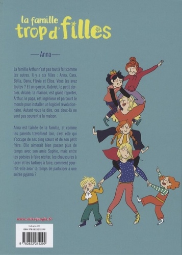 La famille Arthur n'est pas tout à fait comme les autres. Déjà, il y a 6 filles : Anna, Cara, Bella, Dana, Flavia et Elisa. Vous les avez tous ? Et un garçon, Gabriel, le petit dernier. Ariane, la maman, est grand reporter, Arthur, le papa est ingénieur et parcourt le monde pour installer un logiciel révolutionnaire. Autant vous dire que ces deux-là ne sont pas souvent à la maison. Anna est l'aînée de la famille, et comme les parents travaillent loin, c'est elle qui s'occupe de ses cinq soeurs et de son petit frère. Elle aimerait bien passer plus de temps avec son amie Sophie, mais entre les poésies à faire réciter, les chaussures à lacer et les tartines à faire, comment pourrait-elle avoir le temps de participer à une soirée pyjama ?