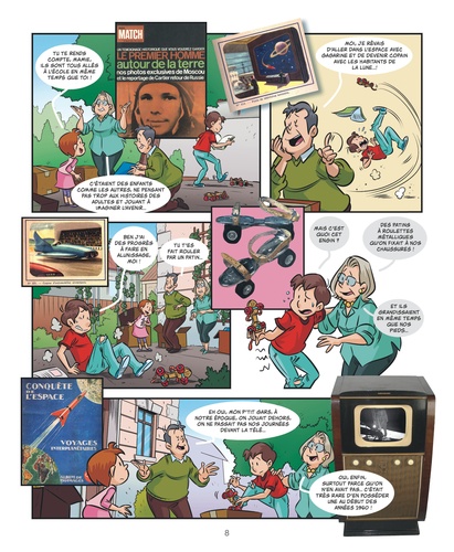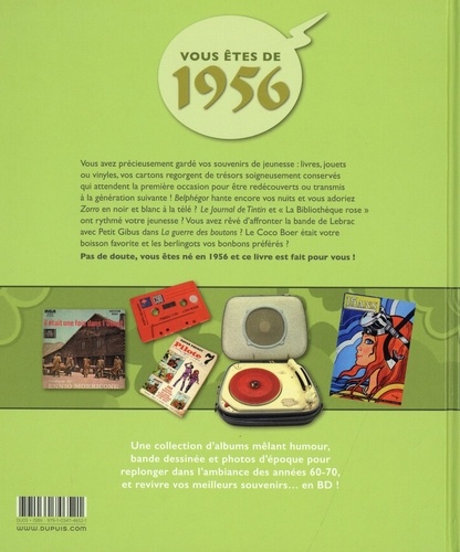 Enfant de 1956 ! Vous avez grandi et vous êtes devenu adulte, mais vous avez précieusement gardé vos souvenirs de jeunesse dans votre coeur. Albums photos, jouets fétiches, livres favoris ou vêtements d'un autre temps : vos cartons regorgent de trésors soigneusement conservés qui attendent la première occasion pour être redécouverts ou transmis à la génération suivante. Retrouvez l'ambiance des années 60 et 70 avec les familles de la collection "Mes Souvenirs en BD" : à l'occasion d'un vide-grenier, d'un nettoyage de printemps ou d'une visite aux grands-parents, une enfant et un adolescent d'aujourd'hui partagent avec leurs aînés les événements, jeux, modes ou saveurs qui ont marqué leur jeunesse. Ce retour dans le temps permet aux deux générations de se rapprocher en s'amusant et de comparer leurs points de vue avec humour. A travers de nombreuses iconographies d'époque, ces personnages attachants nés en 1956 vous feront revivre avec bonheur et nostalgie vos meilleurs souvenirs... en BD !