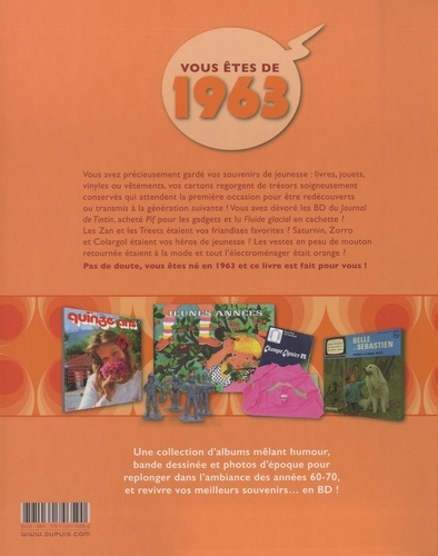 Vous avez précieusement gardé vos souvenirs de jeunesse : livres, jouets, vinyles ou vêtements, vos cartons regorgent de trésors soigneusement conservés qui attendent la première occasion pour être redécouverts ou transmis à la génération suivante ! Vous avez dévoré les BD du Journal de Tintin, acheté Pif pour les gadgets et lu Fluide glacial en cachette ? Les Zan et les Treets étaient vos friandises favorites ? Saturnin, Zorro et Colargol étaient vos héros de jeunesse ? Les vestes en peau de mouton retournée étaient à la mode et tout l'électroménager était orange ? Pas de doute, vous êtes né en 1963 et ce livre est fait pour vous ! Une collection d'albums mêlant humour, bande dessinée et photos d'époque pour replonger dans l'ambiance des années 60-70, et revivre vos meilleurs souvenirs... en BD !
