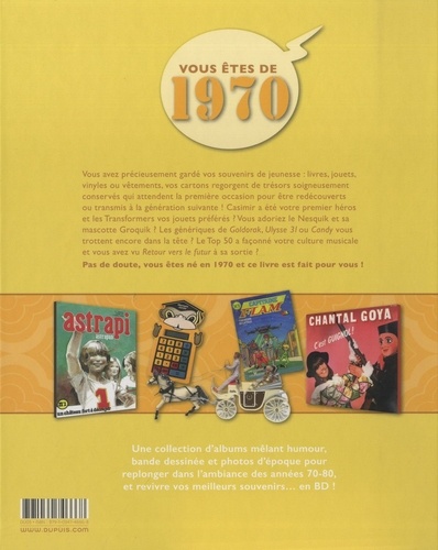 Vous avez précieusement gardé vos souvenirs de jeunesse : livres, jouets, vinyles ou vêtements, vos cartons regorgent de trésors soigneusement conservés qui attendent la première occasion pour être redécouverts ou transmis à la génération suivante ! Casimir a été votre premier héros et les Transformers vos jouets préférés ? Vous adoriez le Nesquik et sa mascotte Groquik ? Les génériques de Goldorak, Ulysse 31 ou Candy vous trottent encore dans la tête ? Le Top 50 a façonné votre culture musicale et vous avez vu Retour vers le futur à sa sortie ? Pas de doute, vous êtes né en 1970 et ce livre est fait pour vous !