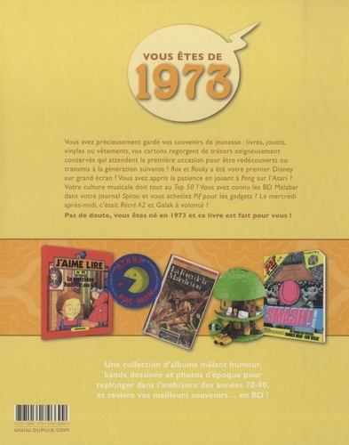 Vous avez précieusement gardé vos souvenirs de jeunesse : livres, jouets, vinyles ou vêtements, vos cartons regorgent de trésors soigneusement conservés qui attendent la première occasion pour être redécouverts ou transmis à la génération suivante ! Rox et Rouky a été votre premier Disney sur grand écran ? Vous avez appris la patience en jouant à Pong sur l'Atari ? Votre culture musicale doit tout au Top 50 ? Vous avez connu les BD Malabar dans votre journal Opirou et vous achetiez Pif pour les gadgets ? Le mercredi après-midi, c'était Récré A2 et Galak à volonté ? Pas de doute, vous êtes né en 1973 et ce livre est fait pour vous !