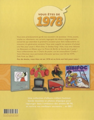 Vous avez précieusement gardé vos souvenirs de jeunesse : livres, jouets, vinyles ou vêtements, vos cartons regorgent de trésors soigneusement conservés qui attendent la première occasion pour être redécouverts ou transmis à la génération suivante ! Vous avez supplié vos parents d'acheter une NES pour jouer à Mario Bros et Donkey Kong ? Ado, vous avez délaissé Les Bisounours et Albator pour Le Prince de Bel-Air et Sauvés par le gong ? Vous collectionniez les "Chairs de poule" et les autocollants Crados ? Votre Discman vous permettait d'écouter partout vos CD de NTM, Daft Punk ou 2Be3 ? Pas de doute, vous êtes né en 1978 et ce livre est fait pour vous !