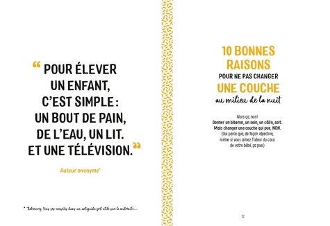 Vous faites de votre mieux pour gérer votre vie de famille et votre vie professionnelle, mais vous êtes souvent épuisée, débordée, à la limite de la crise de nerf ? Rendez-vous à l'évidence, vous n'êtes pas la mère parfaite. Et alors ? Et si vous étiez, tout simplement, une mère comme les autres ? Lisez cet antiguide, décupabilisez, et apprenez à SURTOUT jamais devenir une mère parfaite ! En toutes situations, que ce soit en vacances ou à la maison, à l'école ou chez des amis, apprenez à déjouer les pièges de vos enfants, à prendre plein de temps pour vous, à vous débarrasser de votre progéniture en toute décontraction, à les faire tourner en bourrique... Laissez-vous guider à travers des rubriques hilarantes : "Les 10 commandements" : "10 façons de ne pas entendre son enfant la nuit", "10 idées pour se débarrasser des enfants en vacances"; Des témoignages : "comment j'ai réussi à faire une grasse matinée avec quatre gamins", "comment j'ai survécu à un trajet de 6 heures avec mes deux gosses"; des quiz : "oserez-vous le laisser à la garderie alors que vous êtes en RTT ?", "êtes-vous une bonne mère ?"; des citations décalées ; des infographies.