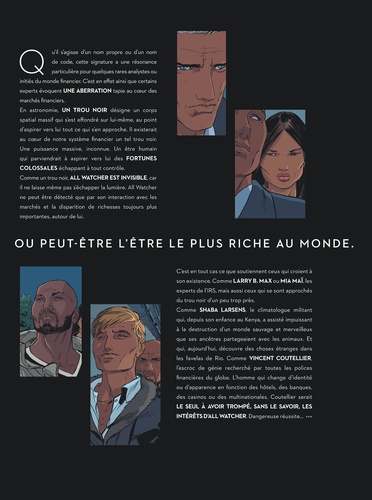 Malgré les contrôles sur les marchés mondiaux, des fortunes colossales disparaissent chaque jour. Certains initiés ont une théorie pour expliquer cette aberration le principe du trou noir financier. Des milliards de dollars seraient inévitablement aspirés vers une entité mystérieuse... qui semble tout voir. All Watcher.
