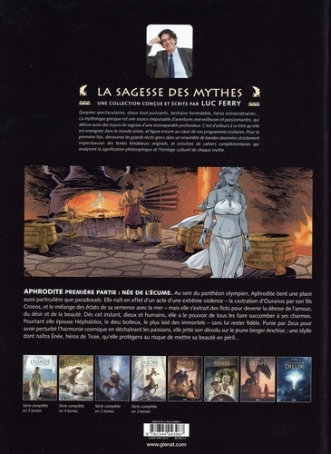 Aphrodite première partie : née de l'écume. Au sein du panthéon olympien, Aphrodite tient une place aussi particulière que paradoxale. Elle naît en effet d'un acte d'une extrême violence - la castration d'Ouranos par son fils Cronos, et le mélange des éclats de sa semence avec la mer - mais elle s'extrait des flots pour devenir la déesse de l'amour, du désir et de la beauté. Dès cet instant, dieux et humains, elle a le pouvoir de tous les faire succomber à ses charmes. Pourtant elle épouse Héphaïstos, le dieu boiteux, le plus laid des immortels - sans lui rester fidèle. Punie par Zeus pour avoir perturbé l'harmonie cosmique en déchaînant les passions, elle jette son dévolu sur le jeune berger Anchise ; une idylle dont naîtra Enée, héros de Troie, qu'elle protégera au risque de mettre sa beauté en péril...