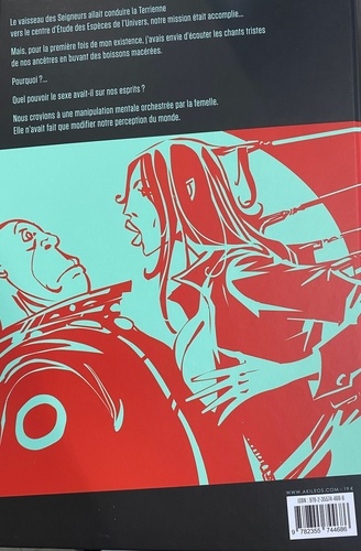 Le vaisseau des Seigneurs allait conduire la Terrienne vers le centre d'Etude des Espèces de l'univers, notre mission état accomplie... Mais, pour la première fois de mon existence, j'avais envie d'écouter les chants tristes de nos ancêtres en buvant des boissons macérées. Pourquoi ? ... Quel pouvoir le sexe avait-il sur nos esprits ? Nous croyions à une manipulation mentale orchestrée par la femelle. Elle n'avait fait que modifier notre perception du monde.