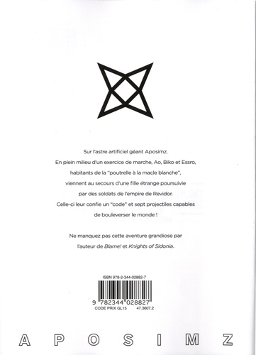Le retour du Grand Tsutomu Nihei Sur l'astre artificiel géant Aposimz, couvert de ruines... En plein milieu d'un exercice de marche, Ao, Biko et Essro, habitants de la "poutrelle à la macle blanche" viennent au secours d'une fille étrange poursuivie par des soldats de l'empire de Revidor. Celle-ci leur confie un "code" et sept projectiles capables de bouleverser le monde ! Dans Aposimz, l'auteur du mythique Blame ! et du déstabilisant Knights of Sidonia puise ce qu'il a pu concevoir de meilleur dans ses différentes oeuvres, pour nous proposer un récit de dark-fantasy contemporain et accessible, qui saura captiver tout autant les fans de la première heure que les néophytes. Si vous êtes un inconditionnel de Nihei, vous vous sentirez en terre familière avec les "marionnettes" qui peuplent cette planète, et si vous découvrez pour la première fois son univers, vous n'aurez qu'à suivre le jeune Esserow pour vous laisser guider par la belle Titania !