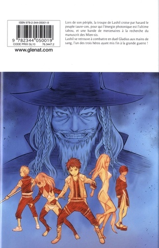 Lors de son périple, la troupe de Lashil croise par hasard le peuple taure-cen, pour qui l'énergie photonique est l'ultime tabou, et une bande de mercenaires à la recherche du manuscrit des mien-sis. Le début d'un combat triangulaire ! Lashil se retrouve à combattre en duel Gladius aux mains de sang, l'un des trois héros ayant mis fin à la grande guerre !