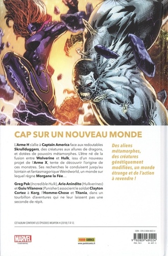 Dans sa lutte contre l'entreprise Roxxon et le minotaure DarioAgger, l'Arme H fait équipe avec CaptainAmerica. Ensemble, ils vont affronter des dragons métamorphes venus de l'espace ! Clay sera aussi envoyé sur le Weirdworld où il va rencontrer sa reine : Morgane La Fée... Suite et fin de la série de GregPak (Weapon X, Planète Hulk) mettant en scène l'Arme H, mélange entre Hulk et Wolverine, qui plaira autant aux fans du Géant de Jade qu'à ceux du célèbre mutant !