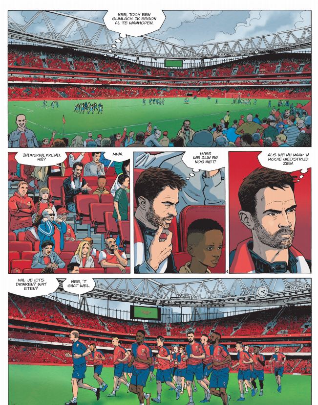 Grote Voetbalclubs in Europa! Een drieluik over ARSENAL F.C. ! In de nieuwe Sportcollectie van Dupuis met verhalen van de grote clubs in Europa verschijnt een drieluik over de Engelse voetbalclub Arsenal F.C. Ideaal voor alle sportliefhebbers en stripfans van deze club en voetbal in het algemeen. Meer dan een voetbalstrip. Een spannend verhaal met Arsenal FC als roemrijk decor. Avonturen waar werkelijkheid en fictie in elkaar overvloeien, rond de Engelse voetbalclub Arsenal. Andrew neemt Nathan, de negenjarige zoon van zijn nieuwe vriendin, mee naar een wedstrijd van Arsenal, de club van zijn hart. Het is de eerste keer dat Nathan een voetbalstadion binnenstapt. Hij is in de wolken, maar weet niet wat hij moet denken van zijn nieuwe stiefvader. De clubliefde van Andrew zorgt ervoor dat het ijs al snel breekt en dat Andrew en Nathan naar elkaar toegroeien. Samen met het tweetal beleven we twintig jaar Arsenal, twintig jaar met de legendarische Arsène Wenger aan het roer. Hij stapt af van het traditionele Engelse ‘kick and rush’ en kiest resoluut voor een dominante spelstijl, met veel balbezit: The Game We Love, een spelstijl die de club roem en titels oplevert.