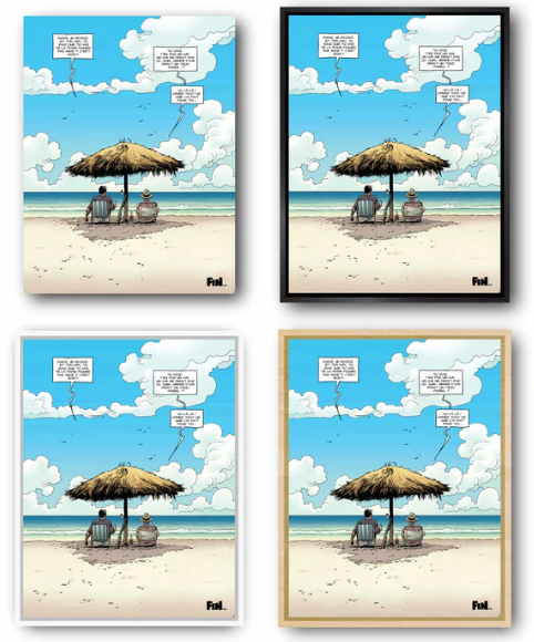 Onze Amerikaanse baklijsten in "L"-profiel worden met de hand in Frankrijk gemaakt van massief hout. Deze frames bieden een elegante esthetiek zonder af te leiden van het kunstwerk. Ze zijn verkrijgbaar in verschillende afwerkingen om te passen bij de sfeer van stripverhalen.