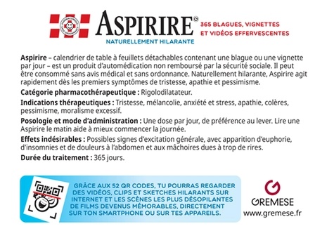 Aspirire - calendrier de table à feuillets détachables contenant une blague ou une vignette par jour - est un produit d'automédication non remboursé par la sécurité sociale. Il peut être consommé sans avis médical et sans ordonnance. Naturellement hilarante, Aspirire agit rapidement dès les premiers symptômes de tristesse, apathie et pessimisme. Catégorie pharmacothérapeutique : Rigolodilatateur. Indications thérapeutiques : Tristesse, mélancolie, anxiété et stress, apathie, colères, pessimisme, moralisme excessif. Posologie et mode d'administration : Une dose par jour, de préférence au lever. Lire une Aspirire le matin aide à mieux commencer la journée. Effets indésirables : Possibles signes d'excitation générale, avec apparition d'euphorie, d'insomnies et de douleurs à l'abdomen et aux mâchoires dues à trop de rires. Durée du traitement : 365 jours.