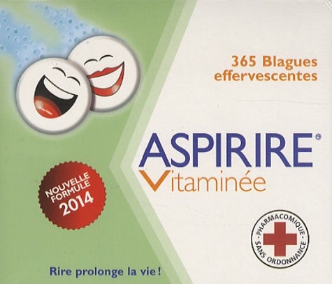 L'aspirire est un produit d'automédication non remboursé par la Sécurité sociale, préconisé dans les cas de symptômes dépressifs, d'état d'anxiété et de stress, d'apathie, de pessimisme, d'atrophie musculaire prononcée de la mâchoire et des zygomatiques. Thérapie et prophylaxie des carences d'humour dues à une mauvaise humeur irréductible. L'aspirire peut être consommée sans avis médical, sous forme de 365 petites blagues sécables, pouvant provoquer des crises d'hilarité chez les sujets sensibles. L'absorption de ce "médicmarrant" peut également entraîner des contractions de l'abdomen. A conserver dans un lieu sec à l'abri de la lumière. Ne pas laisser à la portée des enfants. Posologie et mode d'administration: une Aspirire de préférence au lever aide à mieux commencer la journée. Une seule blague apporte la dose de bonne humeur quotidienne nécessaire. Dans certains cas, il est fortement conseillé de dépasser la dose prescrite. Lire attentivement la notice avant l'utilisation. Durée du traitement : 365 jours Formule pharmaceutique : textes effervescents.