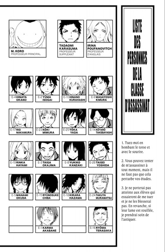 La Lune est détruite à 70 %, la Terre est en sursis ! La menace vient d'un extraterrestre au physique de poulpe, aux capacités hors du commun et réputé indestructible !! Toutefois, comme il trouve que les Terriens sont de trop piètres adversaires, il décide de former la plus mauvaise classe d'une école aux techniques d'assassinat : à la fin de l'année, Nagisa et ses camarades de classe devront parvenir à tuer leur professeur !!