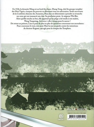 Assassin's Creed : la licence incontournable d'action-aventure et d'infiltration en manga ! En 1526, la dynastie Ming est au bord du chaos. Zhang Yong, chef du groupe templier des Huit Tigres, s'empare du pouvoir en éliminant tous ses adversaires. Seule survivante de la Confrérie chinoise des Assassins, Shao Jun est déterminée à prendre sa revanche sur ceux qui ont massacré son clan. Sa prochaine proie : le seigneur Wei Bin. Alors qu'elle touche au but, elle apprend qu'un piège a été tendu à son maître, Wang Yangming. Arrivera-t-elle à temps pour le sauver ? De retour au présent, Lisa se pose de plus en plus de questions concernant son ascendance. Pour couronner le tout, son amie Mari la met en garde contre les intentions du docteur Kagami, qui agit pour le compte des Templiers.