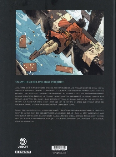 Un savoir secret. Une arme interdite. Angleterre, camp de Ravensthorpe, IXe siècle. Kidnappé par Eivor, une puissante cheffe de guerre viking, Edward, moine copiste, cherche à comprendre les raisons de la disparition de son frère Ecbert... Parmi ses documents, on a retrouvé d'étranges parchemins noircis par un langage hermétique. Personne ne connaît la provenance de ces lettres à l'apparence occulte, mais Edward a déjà vu de tels signes : dans l'atelier d'Hytham, un homme sage qui l'a pris sous son aile. Hytham fait partie d'un ordre secret : Ceux que l'on ne voit pas. Un ordre qui pourrait offrir des réponsesà Edward, et garantir ses aspirations de liberté et de savoir. Roman graphique d'aventure historique teintée d'ésotérisme, cet album marque l'arrivée en grande pompe de la plus culte des licences Ubisoft au catalogue Glénat ! Dans un récit indépendant mais connecté au dernier opus Assassin's Creed Valhalla, Mathieu Gabella et Paolo Traisci jouent avec les meilleurs aspects de l'univers vidéoludique : l'action et la discrétion, la camaraderie et les trahisons, l'Histoire et le mythe...