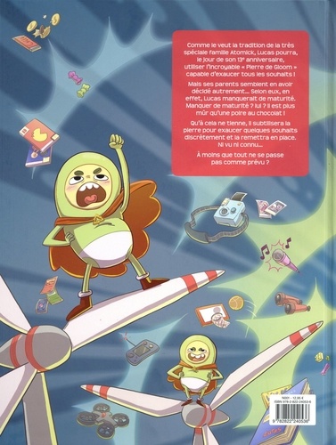 Comme le veut la tradition de la très spéciale famille Atomick, Lucas pourra, le jour de son 13e anniversaire, utiliser l'incroyable " Pierre de Gloom ", capable d'exaucer tous les souhaits ! Mais ses parents semblent en avoir décidé autrement... Selon eux, en effet, Lucas manquerait de maturité. Manquer de maturité ? lui ? Il est plus mûr qu'une poire au chocolat ! Qu'à cela ne tienne, il subtilisera la pierre pour exaucer quelques souhaits discrètement et la remettre en place. Ni vu ni connu... A moins que tout ne se passe pas comme prévu ?