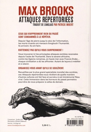 Ceux qui n'apprennent rien du passé sont condamnés à le répéter. Depuis l'âge de pierre jusqu'à celui de l'information, les morts-vivants ont menacé d'engloutir l'humanité. Ils arrivent. Ils ont faim. N'attendez pas qu'ils vous surprennent ! Vous trouverez ici les principales attaques zombies recensées depuis l'aube de l'humanité. Dans la savane africaine, contre les légions romaines, en haute mer avec Francis Drake, chaque civilisation a dû les affronter. Autant de leçons à méditer et à retenir. Organisez-vous avant qu'ils se soulèvent. Recueillies par le plus grand spécialiste mondial des zombies, ces Attaques répertoriées nous révèlent de quelle manière d'autres cultures ont fait face et survécu à cet immémorial fléau viral. Cette immersion dans les horreurs du passé permettra peut-être de nous préparer face à celles de demain.