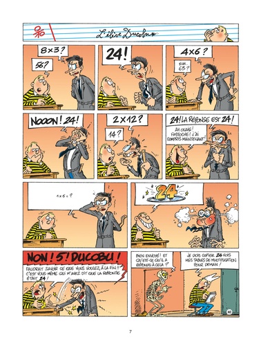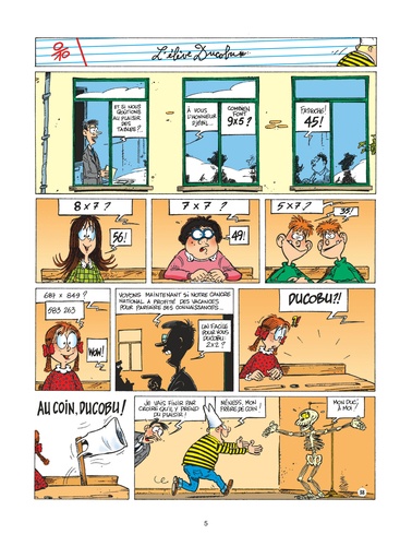 Ce n'est pas en comptant les mouches au plafond que l'on devient fort en maths...C'est qu'il faut être drôlement débrouillard pour réussir à se soustraire au doigt interrogateur de l'instituteur et à l'humiliation du bonnet d'âne ! Et cette Léonie qui déteste les copieurs ! Alors, les réponses qu'il n'a pas pu voler à sa voisine, Ducobu les invente. Mal lui en prend car, bien que très fertile, son imagination lui joue souvent de vilains tours et ses traits de génie échouent régulièrement «au coin» !