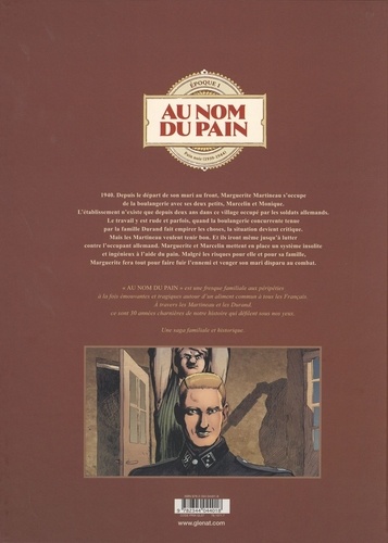 Une recette qui se transmet. 1940. Depuis le départ de son mari au front, Marguerite Martineau s'occupe de la boulangerie avec ses deux petits, Marcelin et Monique. L'établissement n'existe que depuis deux ans dans ce village occupé par les soldats allemands. Le travail y est rude et parfois, quand la boulangerie concurrente tenue par la famille Durand fait empirer les choses, la situation devient critique. Mais les Martineau veulent tenir bon. Et ils iront même jusqu'à lutter contre l'occupant allemand. Marguerite et Marcelin mettent en place un système insolite et ingénieux : pour faciliter le réseau de communication de la Résistance, ils cachent leurs messages dans le pain. Malgré les risques pour elle et pour sa famille, Marguerite fera tout pour faire fuir l'ennemi et venger son mari disparu au combat. Prenant et surprenant, Au nom du pain construit sa dramaturgie autour d'un aliment simple et essentiel. Le temps de deux cycles de deux albums, les auteurs racontent 30 années d'Histoire de France. Une saga familiale historique documentée qui amène un vent de fraîcheur au genre, notamment grâce à l'influence du cinéma de Tarantino, Hitchcock et De Palma.