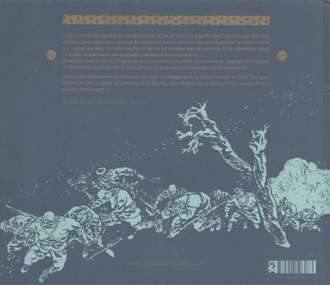 A une journée de marche de l'antique cité de Xi'an, se trouve le pays du Cerf blanc. En son chef-lieu de Bailu, la vie s'écoule au rythme des saisons et des travaux des champs, tandis que la vieille rivalité qui oppose les deux familles des Bai et des Lu ne manque pas de suivre le fil du calendrier rituel ni d'obéïr à l'alternance des mariages, naissances et enterrements. Quand survient la fin de l'Empire en 1911, la querelle villageoise va se mettre au diapason de l'Histoire et s'alimenter peu à peu du trouble jeté par la succession des épisodes révolutionnaires. Devenu un classique de la littérature chinoise contemporaine, le célèbre roman de Chen Zhongshi trouve ici, par la grâce du pinceau de Li Zhiwu, une adaptation graphique à la mesure de son univers foisonnant.