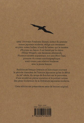 1909. L'écrivain Futabatei Shimei rédige son testament à bord du bateau qui le ramène au Japon. Il est hanté par la vision d'Elise Weigert, une danseuse allemande. Quelques années plus tôt, son ami Mori Ogai, qui allait inventer le roman autobiographique à la japonaise, avait fait primer son devoir sur ses sentiments et rompu sa liaison avec la jeune femme. Ambitieuse fresque littéraire et historique couvrant le période charnière de l'histoire japonaise qu'est le début du XX ? siècle, Au temps de Botchan est le panorama d'une société en pleine mutation et le portrait intime des pères fondateurs de la littérature japonaise moderne.