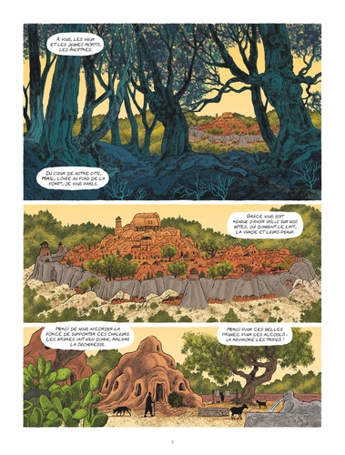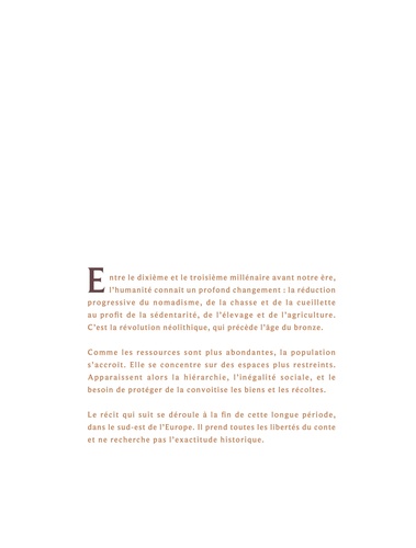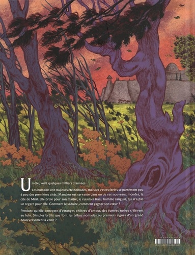 Un été, voilà quelques milliers d'années. Les humains ont toujours été nomades, mais les vastes forêts se parsèment peu à peu des premières cités. Manakor est servante dans un de ces nouveaux mondes, la cité de Miril. Elle brûle pour son maitre, le cuisinier Kaal, homme sanguin, qui n'a pas un regard pour elle. Comment le séduire, comment gagner son coeur ? Pendant qu'elle concocte d'étranges philtres d'amour, des fumées noires s'élèvent au loin. Simples brûlis que font les tribus nomades ou premiers signes d'un grand bouleversement à venir ?
