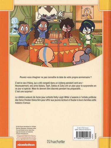 Pouvez-vous imaginer ne pas connaître la date de votre propre anniversaire ? C'est le cas d'Aang, qui a été congelé dans un iceberg pendant cent ans ! Heureusement, ses amis Katara, Toph, Sokka et Zuko ont un plan pour le surprendre en ce jour si spécial. Mais ils devront être discrets pendant les préparatifs... C'est une surprise ! La célèbre auteure de livres pour enfants Kelly Leigh Miller s'associe à l'artiste préférée des fans d'Avatar Diana Sim pour offrir aux jeunes lecteurs d'Avatar à leurs familles cette histoire d'amour.